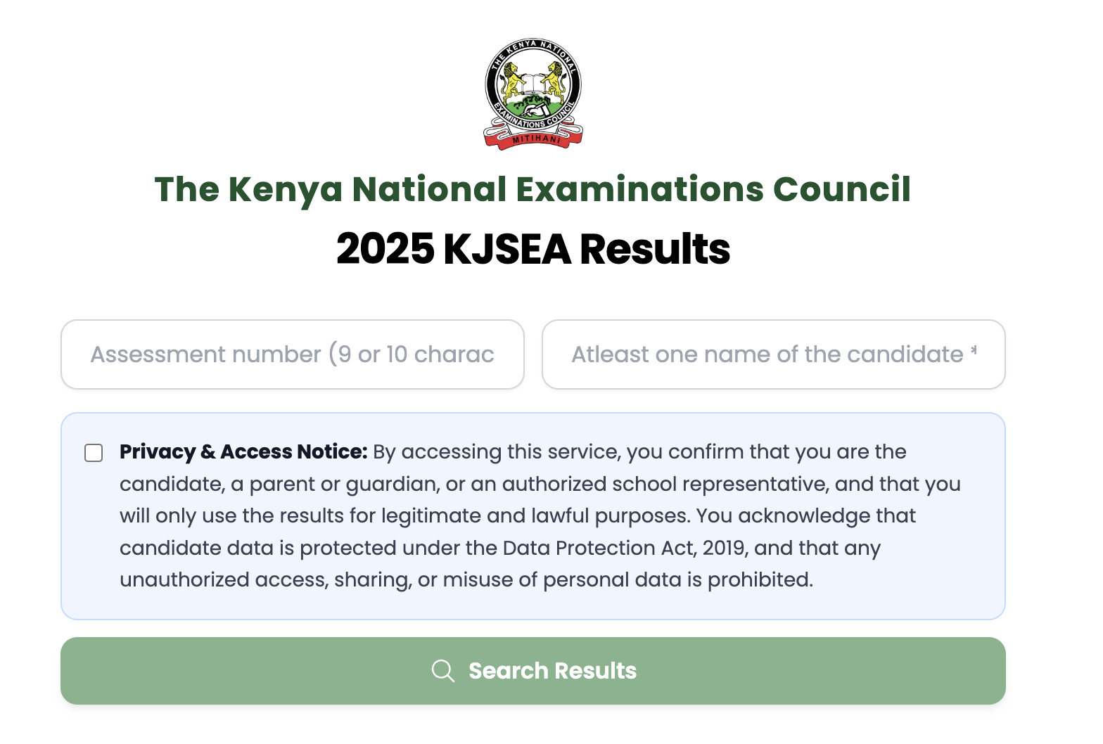 To access candidates’ results, click here. Note: you must enter both the Assessment Number and the candidate’s name to search. You must also accept the data protection consent to proceed with getting results.